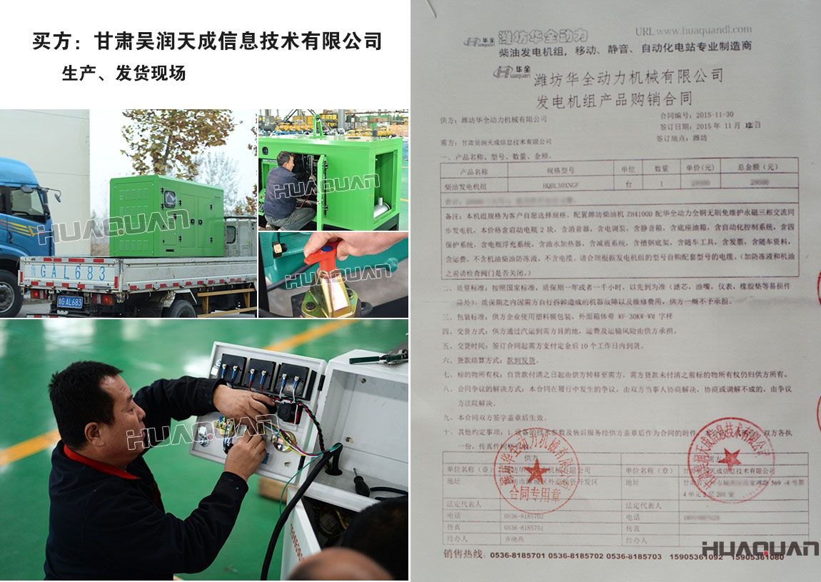 作為信息技術公司離不開電力的支持。為了避免因缺電、停電而造成的經濟損失。甘肅吳潤天成信息技術有限公司在2014年8月30日、2015年11月12日分別在華全動力采購一臺柴油發電機組。