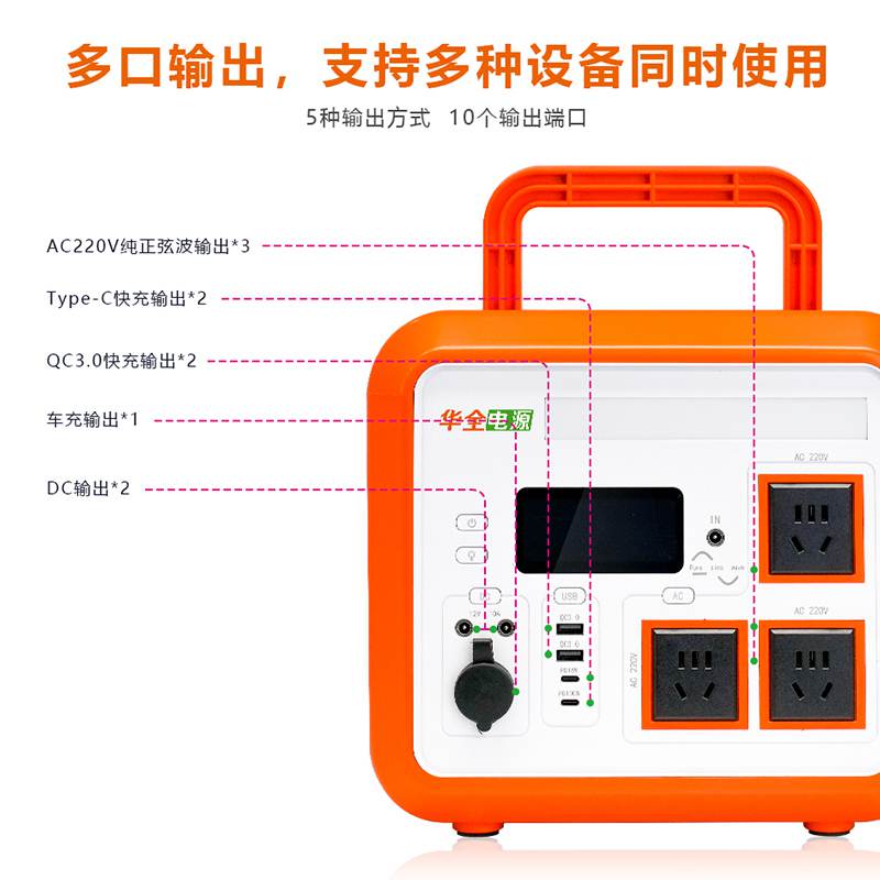 HQDY-1500-B搭配了5種共10個(gè)端口,包括AC220V純正弦波輸出*3、DC輸出*2、QC3.0快充輸出*2、車充輸出*1、Type-C快充輸出*2,支持多個(gè)設(shè)備同時(shí)使用電源。