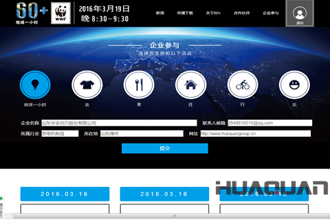 為藍生活,重現藍天。作為企業公民,華全動力已連續數年參與地球一小時活動,踐行環保承諾。2016年3月,華全動力將繼續全面參與,以